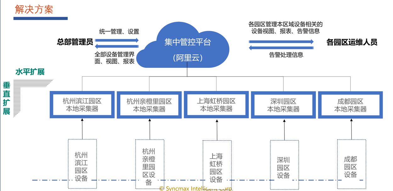 1)阿里置业在全国创建5个智慧园区,并计划未来建成30个智慧园区。同时,随着园区的建设和扩展,面临着各园区设备设施缺乏统一监控管理,要管理的设备多,运维人员少,运维系统可靠性差,灵活可扩展性等挑战。